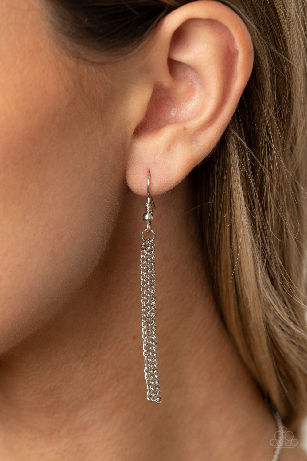 An oval turquoise stone is pressed into a glistening silver frame stamped in antiqued tribal inspired patterns. A shimmery silver chain tassel swings from the bottom of the earthy pendant for a whimsical finish. Features an adjustable clasp closure.