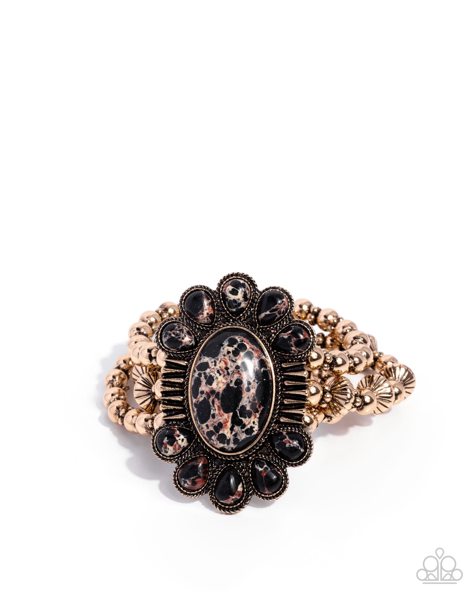 A black oval stone with red and white marbling anchors the center of a boldly ornate antiqued gold frame. Teardrop accent stones in matching spotted hues fan around the center stone, while three rows of gold beads wrap around the wrist on stretchy bands for a comfortably dramatic finish. As the stone elements in this piece are natural, some color variation is normal.