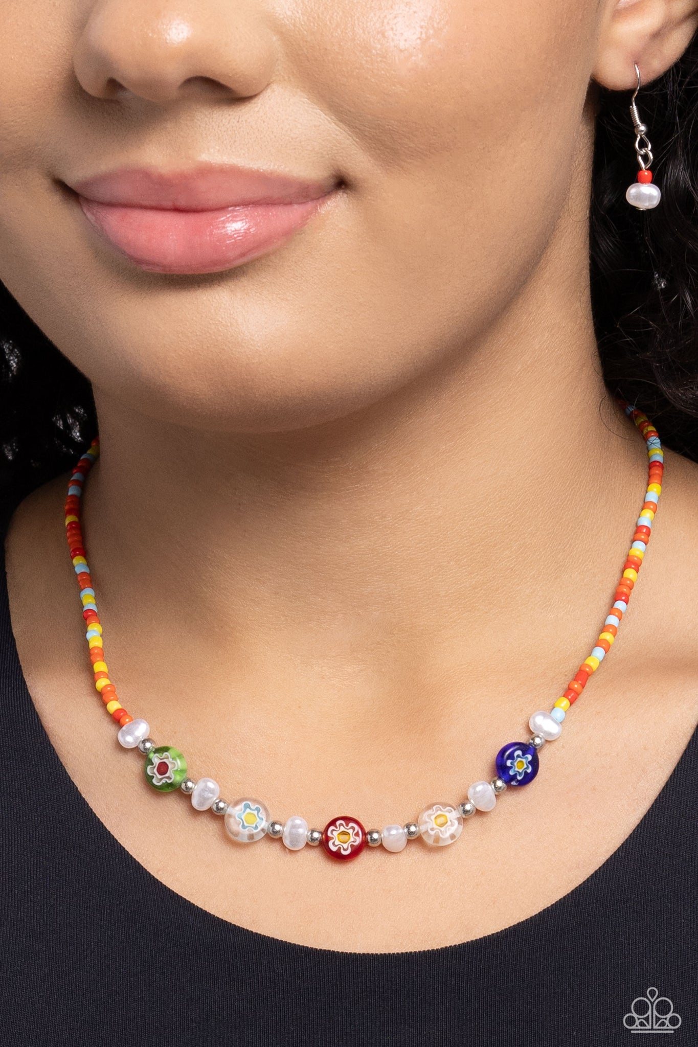 Infused along an invisible string, a collection of light blue, yellow, red, and orange seed beads is interrupted by white baroque pearl beads, silver beads, and floral-painted multicolored beads for a trendy statement below the neckline. Features an adjustable clasp closure.